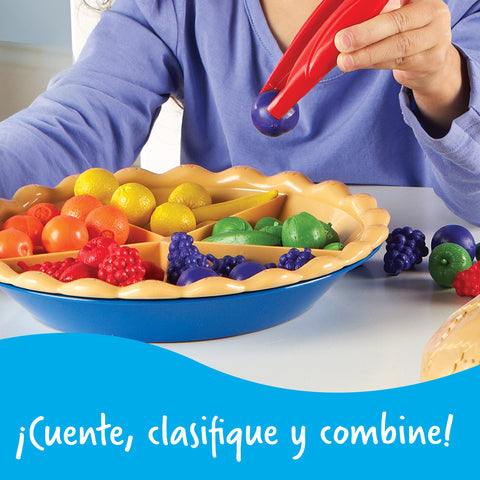 - Este colorido pie de conteo incluye 60 contadores (7 frutas en 5 colores diferentes), un plato de pastel de plástico con tapa y divisor removible, 3 tarjetas de clasificación de doble cara, 2 pinzas gigantes y una guía de actividades.