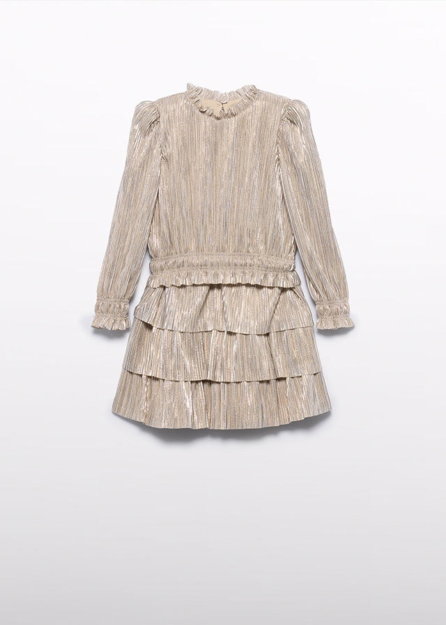 ¡Divino y elegante conjunto de blusa con su falda a juego! ¡Con detalles que lo hacen lucir chic y elegante! Blusa de cuello redondo, manga larga, elastico en puños y bajo para mejor ajuste, tela plisada con glitter dorado, cierre de botones por atras y su falda a juego con elastico en la citnura para un mejor ajuste, diseño con olanes.