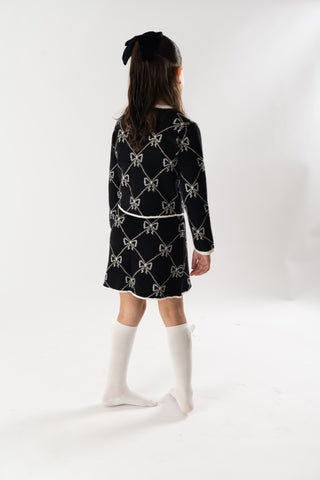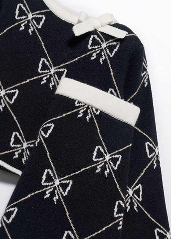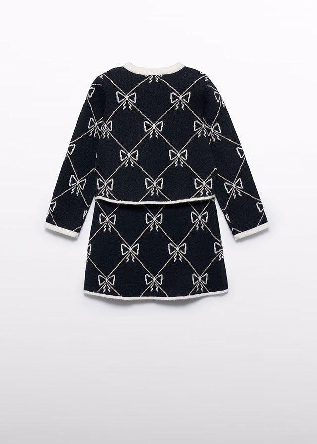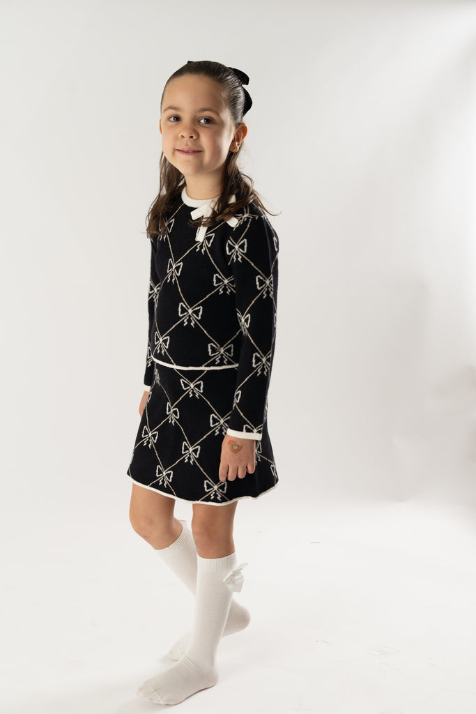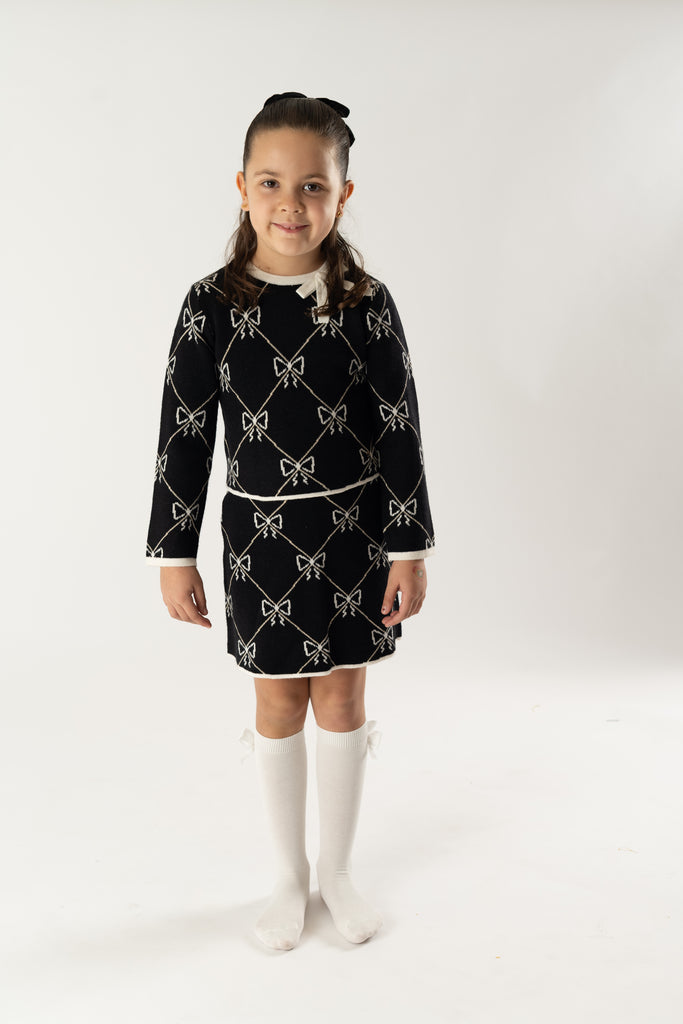 ¡Divino y elegante conjunto de sueter y falda a juego! Sueter de manga larga, cuello redondo con detalle de lazo y su falda a juego con elastico en la cintura. Diseño de rombos con lazos bordado.