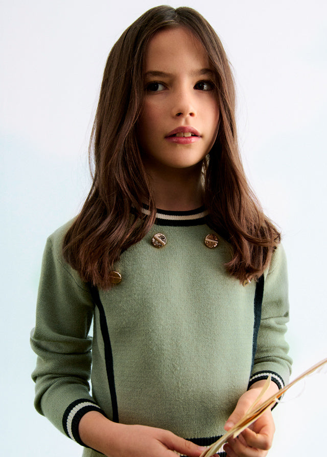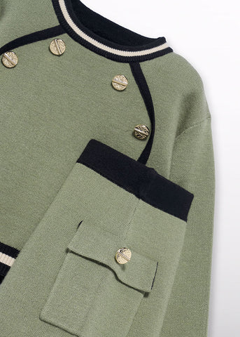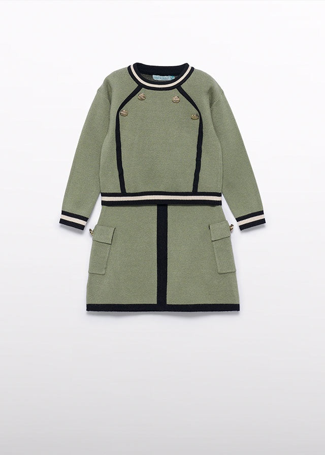 ¡Divino y elegante conjunto de sueter y falda a juego! Sueter de manga larga, cuello redondo con detalle de botones bordados. Con su falda a juego con elastico en la cintura y detalle de bolsillos laterales. Diseño con lineas.