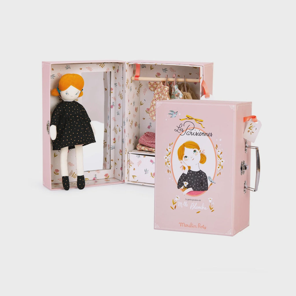 ¡Hermoso Maletín-Armario rosa con su asa lo que la hace perfecta para transportar a todos lados! Abrelo y descubre un hermoso armario acompañado de una encantadora Muñeca de trapo parisina, viene con su espejo para que pueda modelar sus diferentes outfits, 3 vestidos hermosos, un tubo con sus ganchos para colgarlos y un cajon ¡Un increible regalo para dar o recibir!