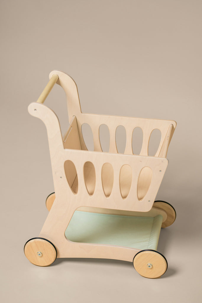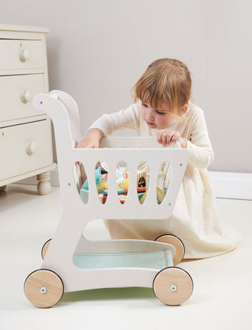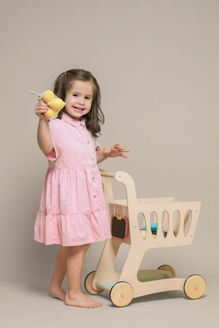 ¿Listo para ir de compras al supermercado? ¡Haz tus compras utilizando este carrito de supermercado de madera! Diseño moderno con ruedas de madera natural con bordes de goma lo cual lo hace estable para los pequeños que empiezan a caminar. Cuenta con una base de tela que agrega espacio adicional para todas esas delicias del supermercado y un bonito pizarrón con forma de manzana, el cual es perfecto para escribir una lista de compras o dibujar imágenes.