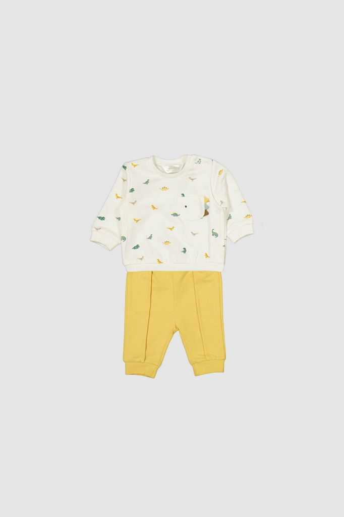¡Basico y comodo conjunto de sudadera con sus pants a juego! Sudadera de cuello redondo, manga larga, dibujo frontal bordado de dinosaurios. Cierre de botones a presion por un lado para facilitar su puesta. Y sus pants a juego de color liso con elastico en la cintura y en los tobillos para un mejor ajuste. Tela de algodón elástico para mayor comodidad y durabilidad.