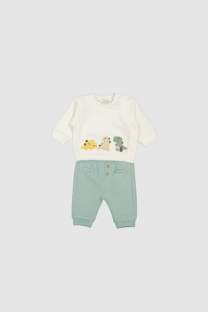 ¡Basico y comodo conjunto de sudadera con sus pants a juego! Sudadera de cuello redondo, manga larga, estampado de dinosaurios. Cierre de botones a presion por un lado para facilitar su puesta. Y sus pants a juego de color liso con elastico en la cintura y en los tobillos para un mejor ajuste.
