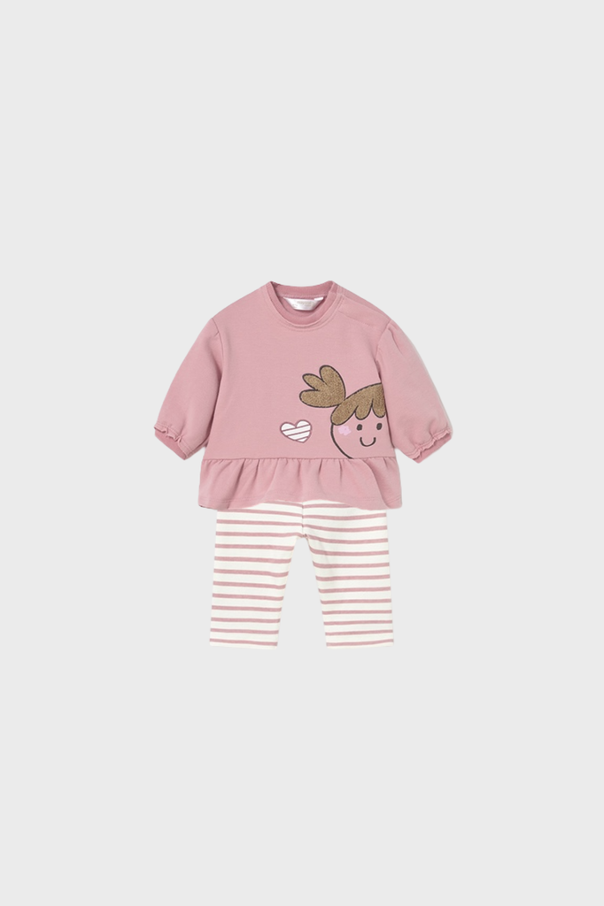 ¡Basico y comodo conjunto de sudadera con sus pants a juego! Sudadera de cuello redondo, manga larga, dibujo frontal. Cierre de botones a presion por el hombro para facilitar su puesta. Y sus pants a juego de rayas con elastico en la cintura para un mejor ajuste.