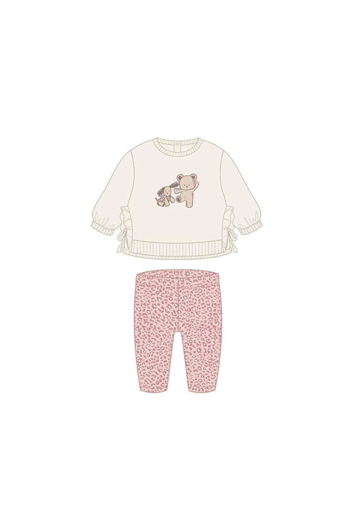 ¡Hermoso y basico conjunto de dos piezas a juego! Sudadera de manga larga con puños elásticos, cuello redondo, cierre trasero de botones a presion, modelo con diseño de lazos y con sus leggings a juego, elástico en la cintura y diseño estampado.
