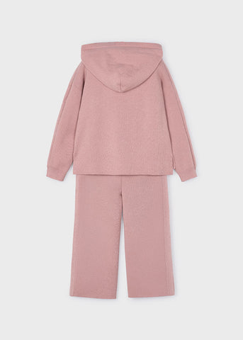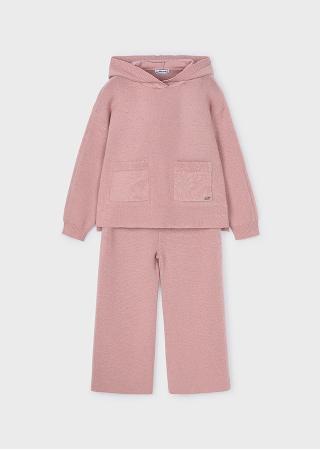 ¡Hermoso set de dos piezas tejidas de punto tricotosa de tacto suave y agradable! Parte superior de líneas relajadas, cuello con capucha, modelo con aberturas laterales en el bajo que dan mayor holgura y bolsillos funcionales en la parte delantera y sus pantalones a juego con elastico en la cintura y corte acampanado.