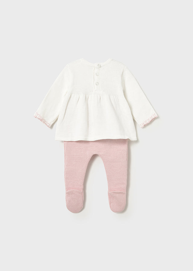 ¡Encantador conjunto tejido de dos piezas a juego! Sueter de manga larga, cuello redondo, detalle de bordados frontales, cierre con botones en la parte posterior. Y con sus pantalones con pies a juego y elastico en la cintura.