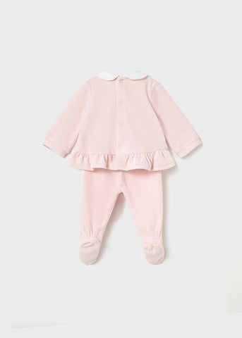 ¡Encantador conjunto afelpado de dos piezas a juego! Parte de arriba de manga larga, cuello camisero redondo, detalle de bordados frontales, cierre con botones a presión en la parte posterior. Y con sus pantalones con pies a juego y elastico en la cintura.