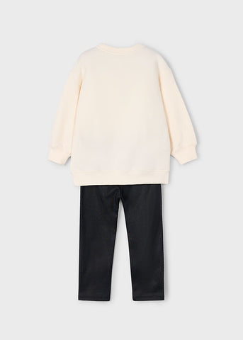 ¡Divino conjunto de sudadera y leggings a juego! Sudadera de manga larga con elastico en puños, cuello redondo y dibujo estampado con sus leggings a juego de color liso de cuero sintetico con elastico en la cintura.