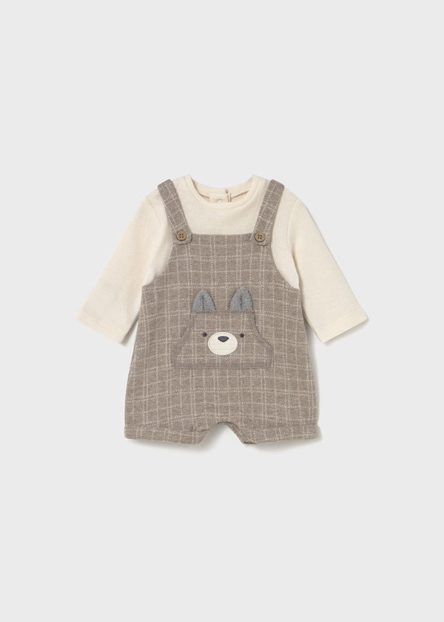 ¡Divina pieza que simula ser dos! De cuello redondo, manga larga, diseño de playera con su overol sobrepuesto, corto, detalle de botones en tirantes y bolsillo en el pecho con carita y orejas de zorro. Cierre de botones a presion por atras y en la entrepierna para facilitar su puesta.