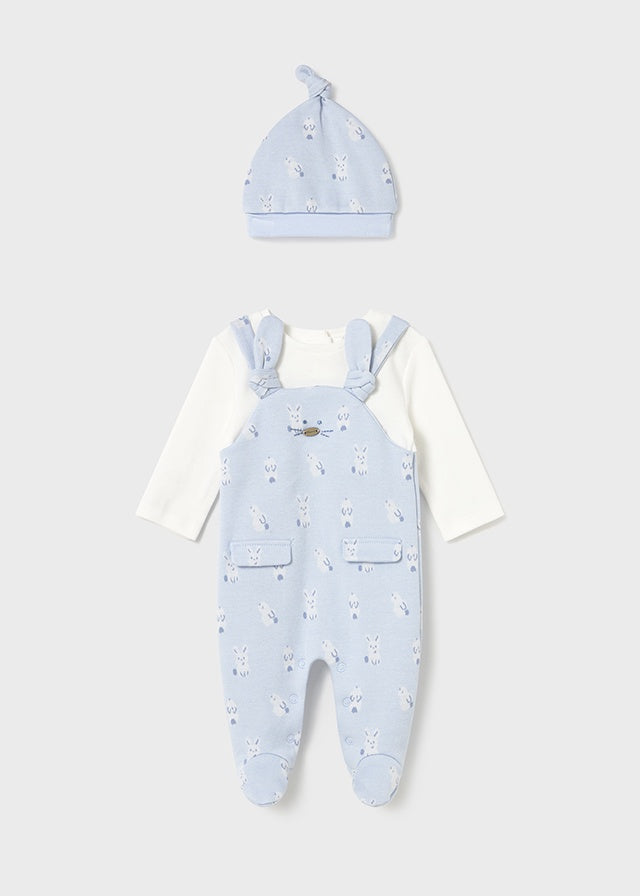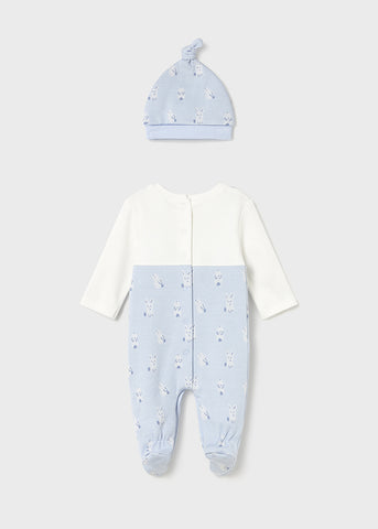 ¡Divino y tierno set de mameluco con su gorrito a juego! Mameluco de cuello redondo, manga larga, diseño con overol simulado sobrepuesto, de lazo en tirantes, diseño estampado, bolsillos laterales y cierre con botones a presión en la parte posterior y en la entrepierna para facilitar la puesta de la prenda. Y con su gorro a juego hecho de materiales cálidos y flexibles, que garantizan un ajuste perfecto a la cabeza y máxima comodidad para protegerle del frío.
