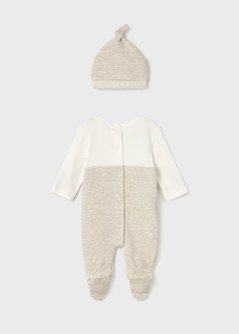 ¡Divino y tierno set de mameluco con su gorrito a juego! Mameluco de cuello redondo, manga larga, diseño con overol simulado sobrepuesto, de tirantes con botones, bolsillos frontales, detalle de dibujo bordado y cierre con botones a presión en la parte posterior y en la entrepierna para facilitar la puesta de la prenda. Y con su gorro a juego hecho de materiales cálidos y flexibles, que garantizan un ajuste perfecto a la cabeza y máxima comodidad para protegerle del frío.