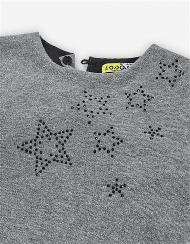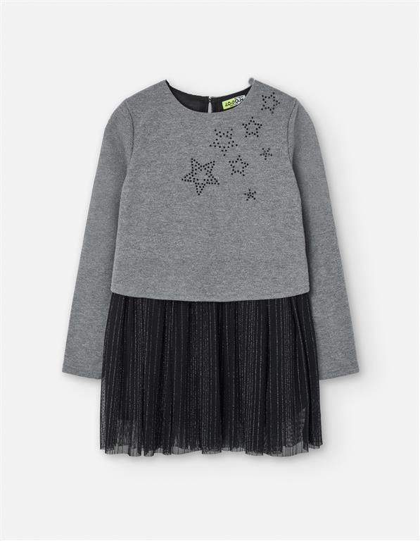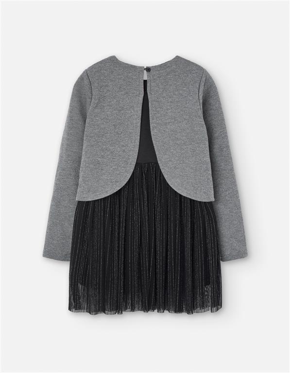 ¡Divino vestido de dos piezas simuladas para niña! ¡Confección combinada en distintos tejidos para conseguir un diseño único y especial! Vestido de cuello redondo, manga larga, corte en la cadera con falda plisada, cierre de unico botón por atras para facilitar la puesta de la prenda, diseño con piedras incrustadas.