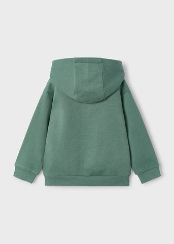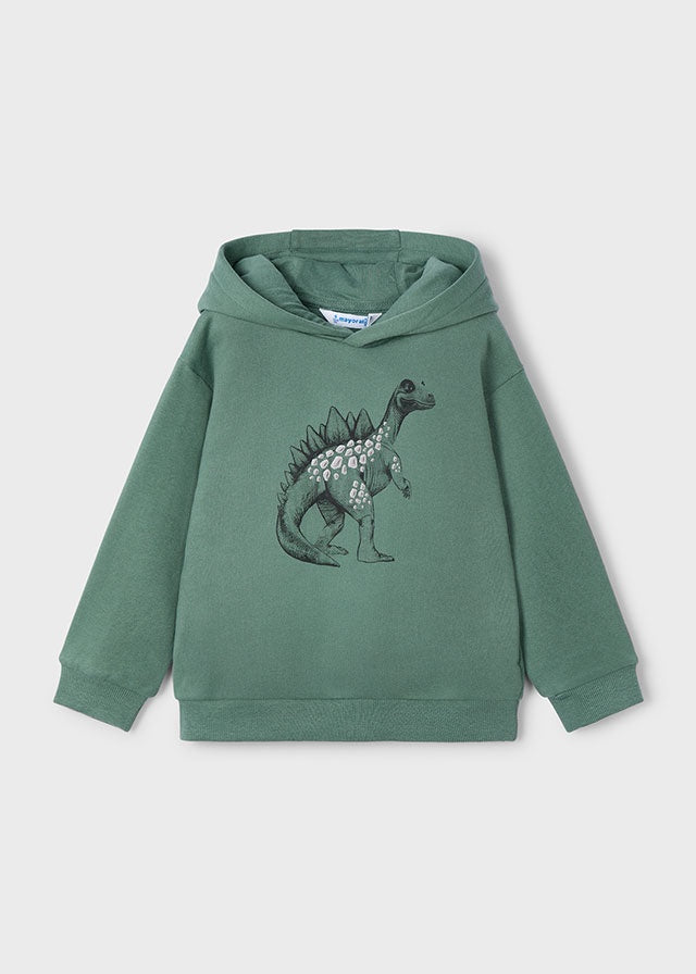 Sudadera de cuello redondo con capucha, manga larga con elastico en puños, bolsillo frontal y con dibujo de dinosaurio engomado.