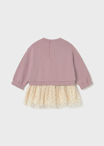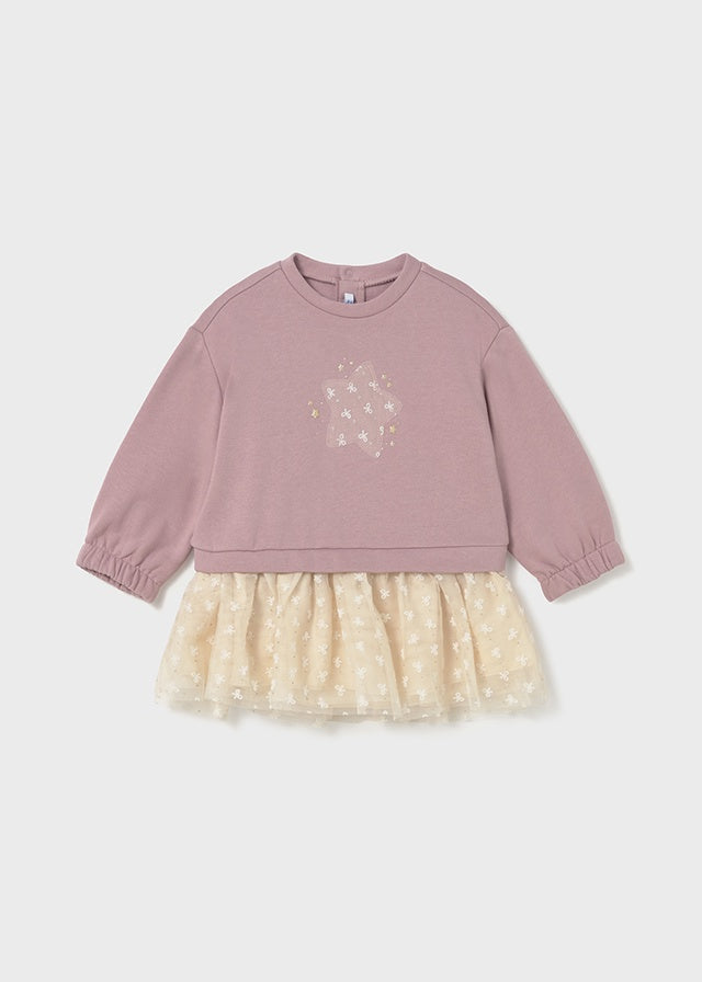 ¡Padrisimo vestido combinado de sudadera con falda! De cuello redondo, manga larga, diseño simulado con sudadera en superposición, cierre con botones a presión en la parte posterior, bajo confección en tejido de tul ligero y vaporoso.