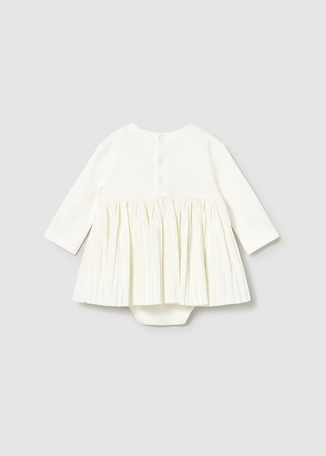 ¡Hermoso vestido con body integrado! Confección combinada en distintos tejidos para conseguir un diseño único y especial, de cuello cisne, manga larga, cierre con botones a presión en la parte posterior y en la entrepierna para facilitar la puesta de la prenda.