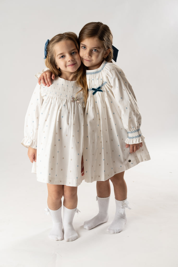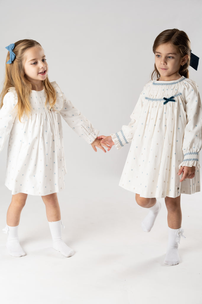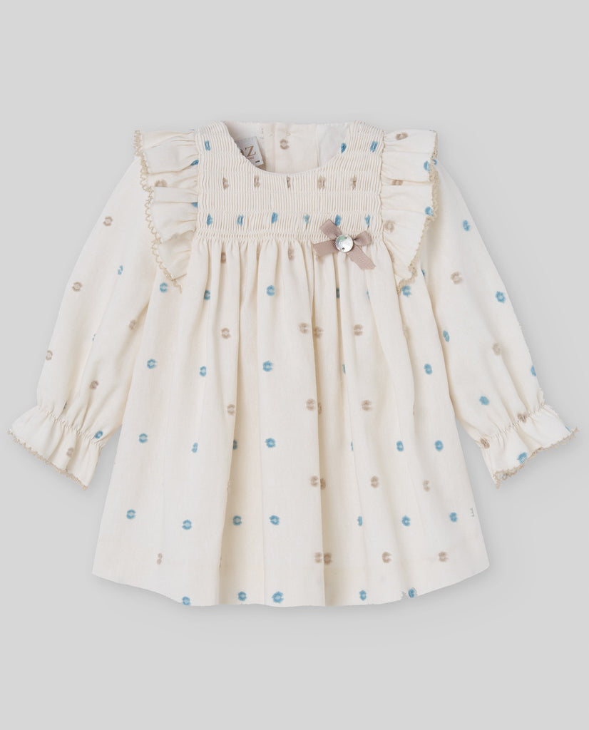 ¡Divino y encantador vestido con detalles unicos que lo hacen lucir elegante! Cuello redondo, detalle de smock en el pecho con lazo, olanes desde los hombros que bajan hacia el pecho, manga larga con elastico en puños y corte en A. Cierre de botones por atrás para una puesta fácil y rápida. Tela estampada con plumety.