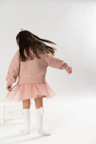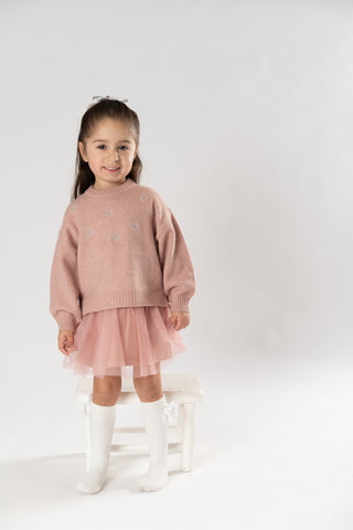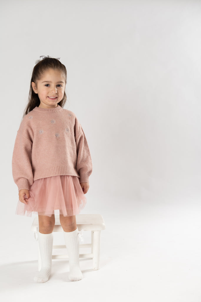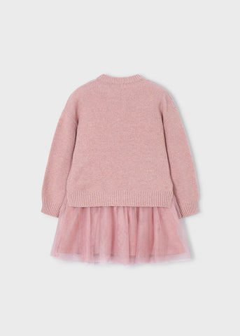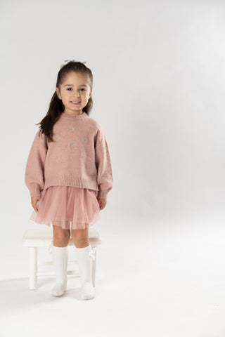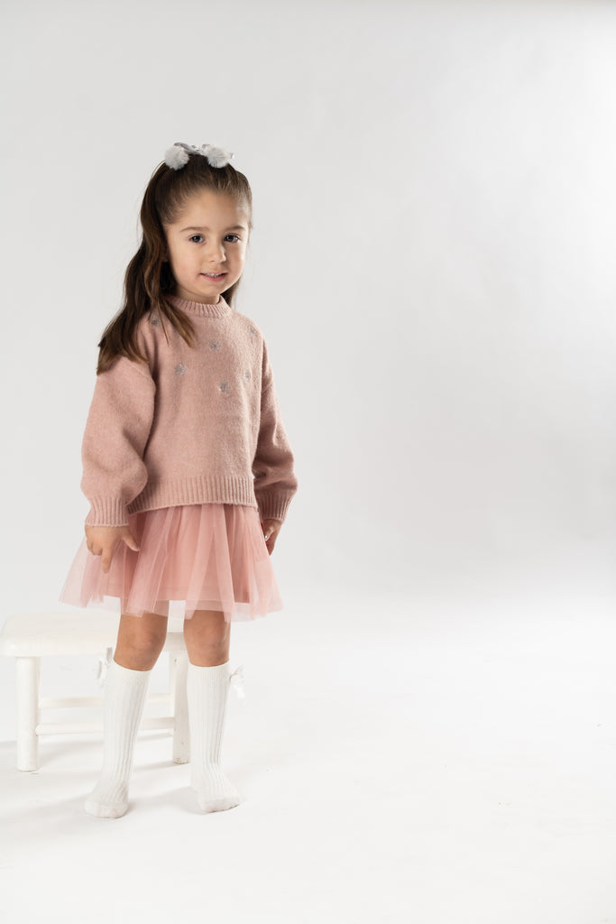¡Divino vestido de dos piezas de tejido punto tricotosa de tacto suave y agradable! Conjunto de vestido sin mangas con rizo y sueter de manga larga, cuello redondo, diseño con apliques florales.