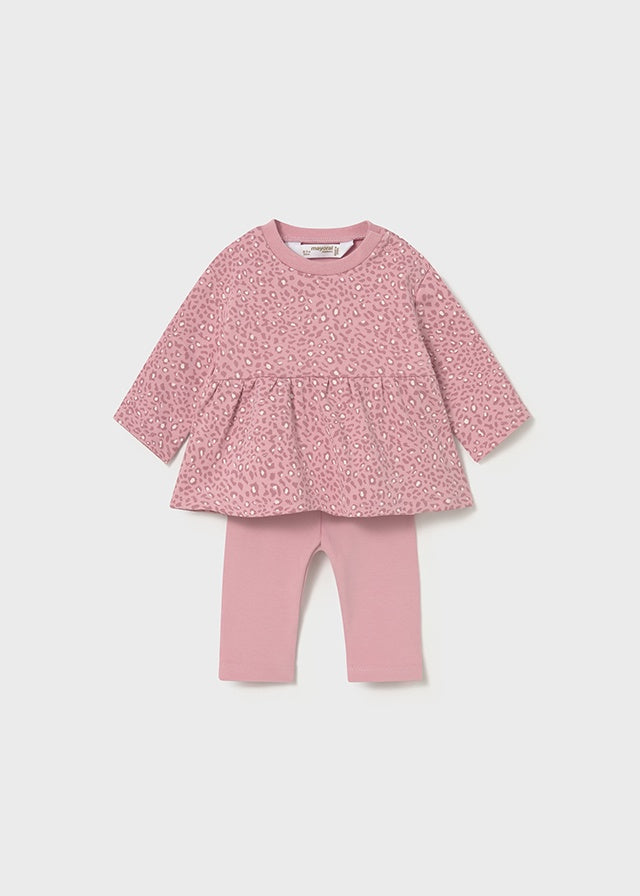 ¡Basico y comodo conjunto de dos piezas a juego! Blusa de cuello redondo, manga larga, cierre de botones a presion por el hombro, diseño estampado y sus leggings a juego de color liso, elastico en la cintura para un mejor ajuste.