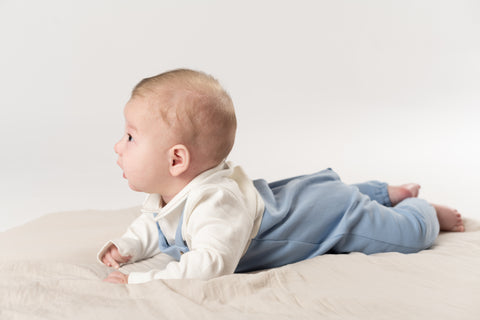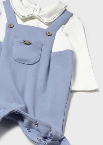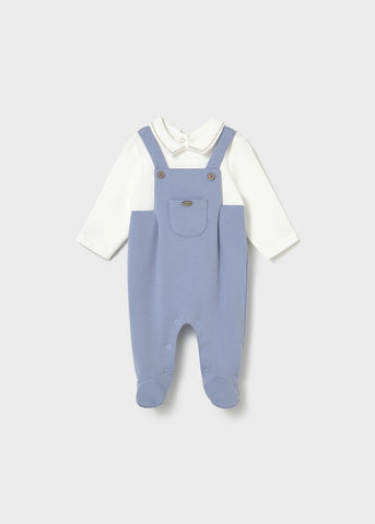 ¡Encantador mameluco que simula ser dos piezas! Cuello camisero, manga larga, overol sobrepuesto de tirantes con botones, detalle de bolsillo en el pecho y cierre de botones a presion por la parte de atras y en la entrepierna para facilitar su puesta.