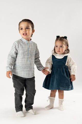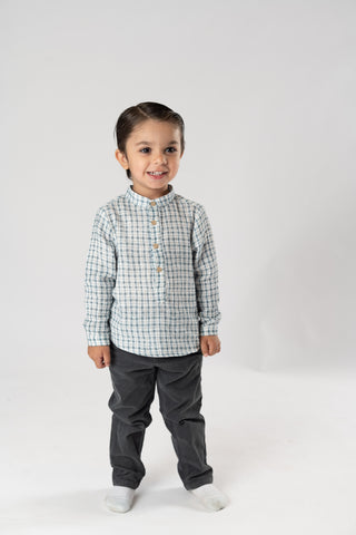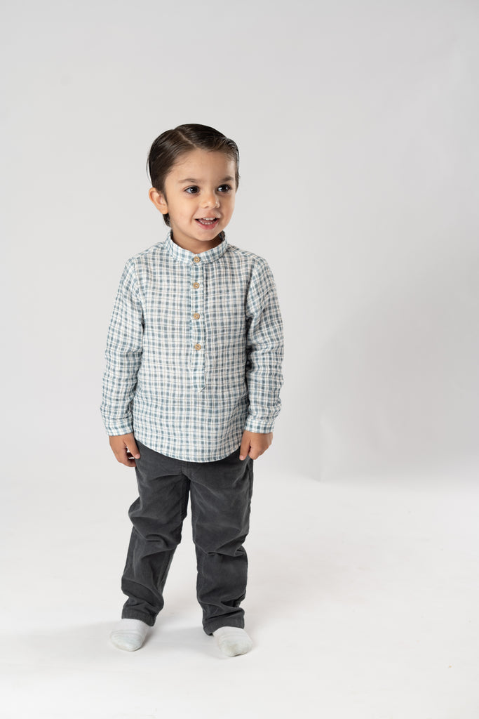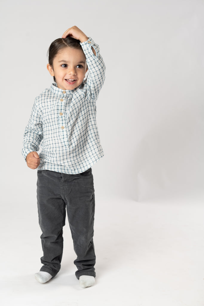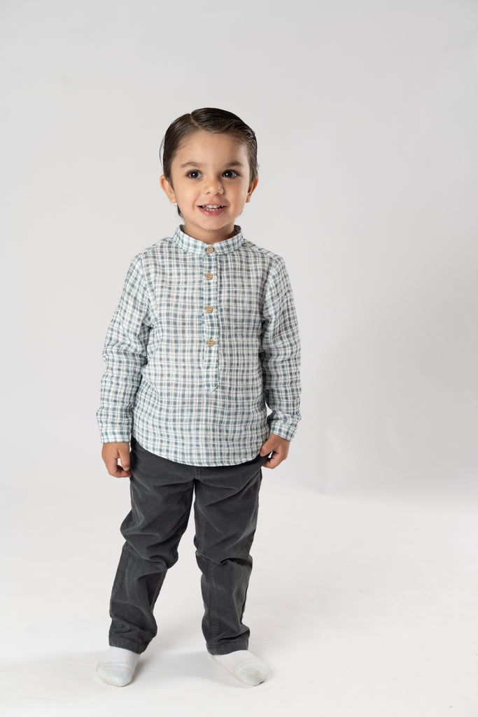¡Divina y elegante camisa de cuadros color azul! De cuello mao, manga larga ajustable con trabilla y cierre de botones por el frente. Combinable con varios productos de la misma coleccion.