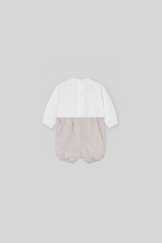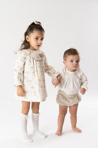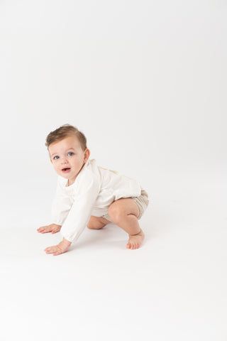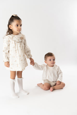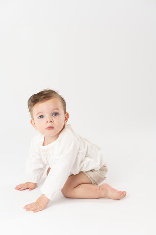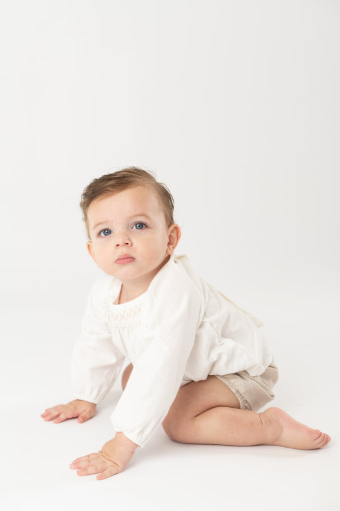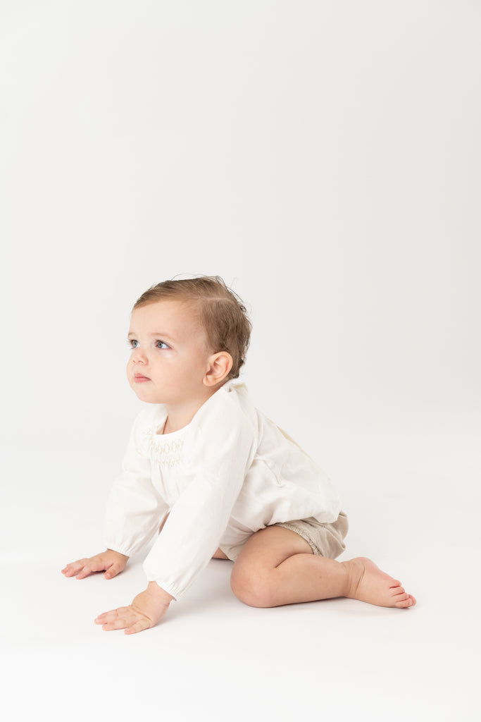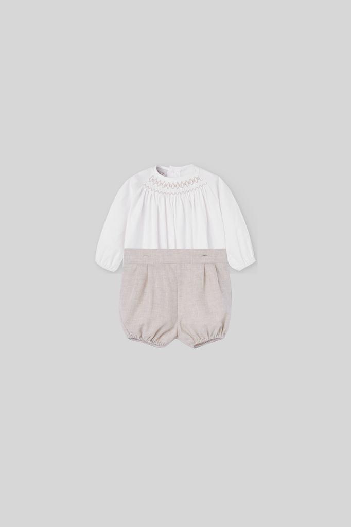 ¡Divino y elegante conjunto de shorts con camisa a juego! ¡Pensado especialmente para ocasiones especiales! Camisa con cuello redondo con detalle de smock, manga larga con puños elasticos, botones de nácar en la parte delantera que se adhieren a los pantalones cortos para un acabado limpio. Cierre de botones por atrás para facilitar su puesta. Pantalones cortos con elastico en pierna y cintura para mayor ajuste.