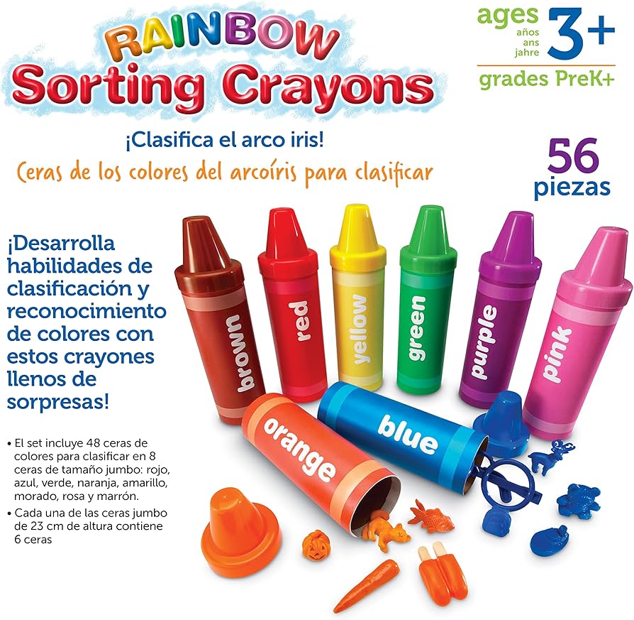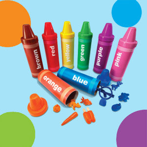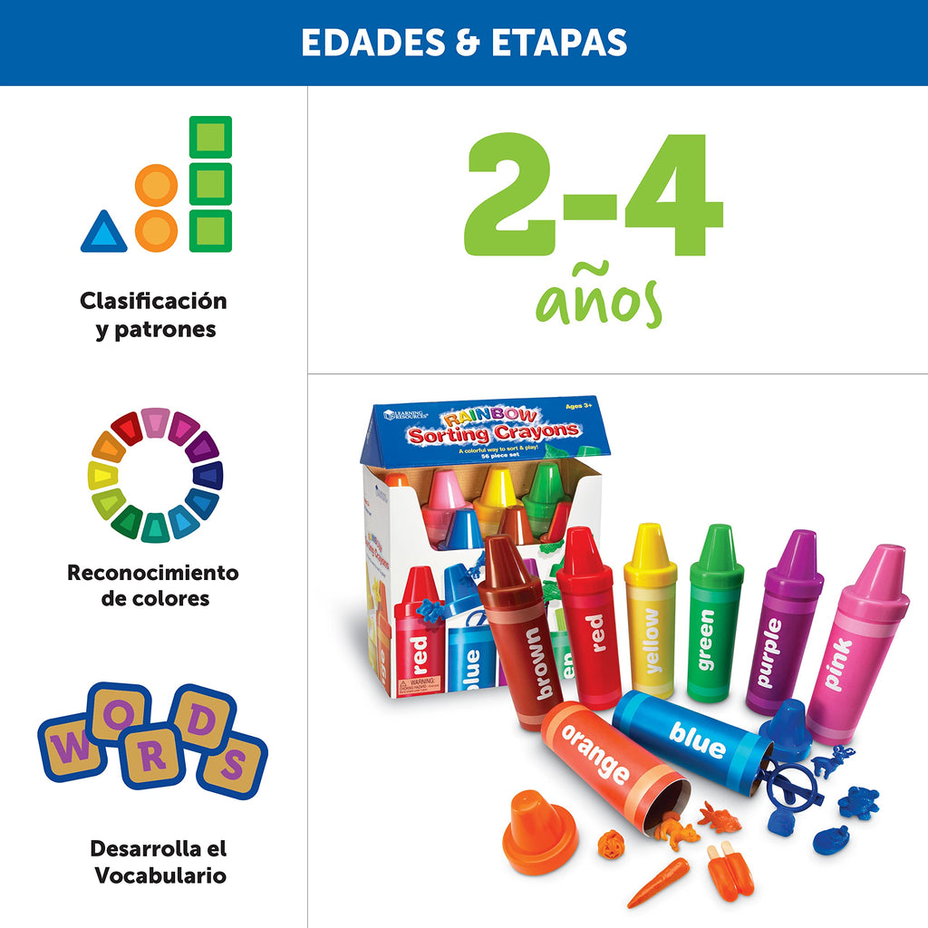 ¡Un arco iris de posibilidades de juego viene empaquetado dentro de estos crayones gigantes! Los crayones invitan a los niños a mirar dentro de cada crayón y descubrir diferentes figuras de diferentes colores para unir, clasificar y jugar imaginativamente. Un estilo de aprendizaje visual y táctil que ayudara al desarrollo de habilidades de conceptos básicos como identificar los colores y objetos, aprender sobre cantidades, crear secuencias y comprender relaciones espaciales como al lado, detrás y delante