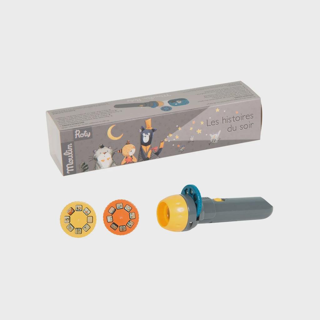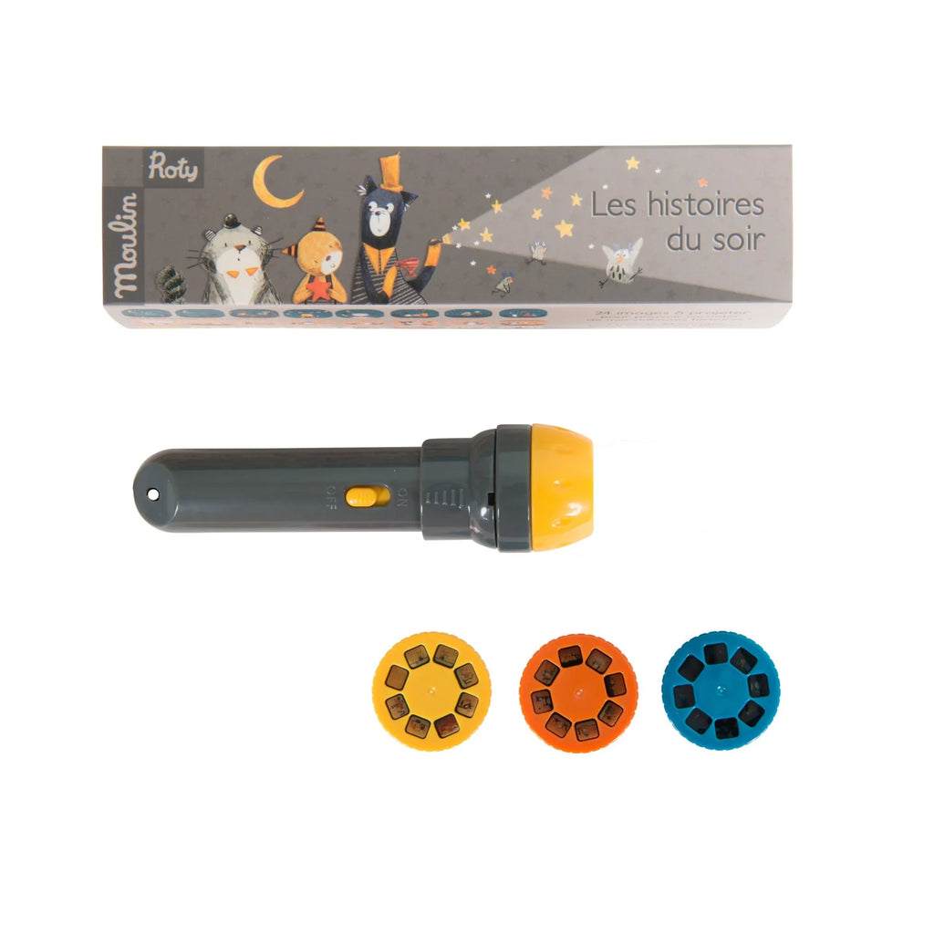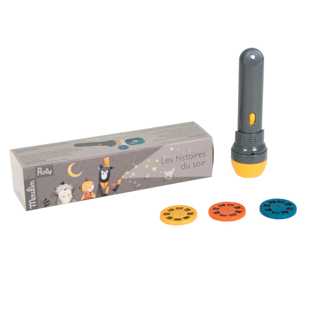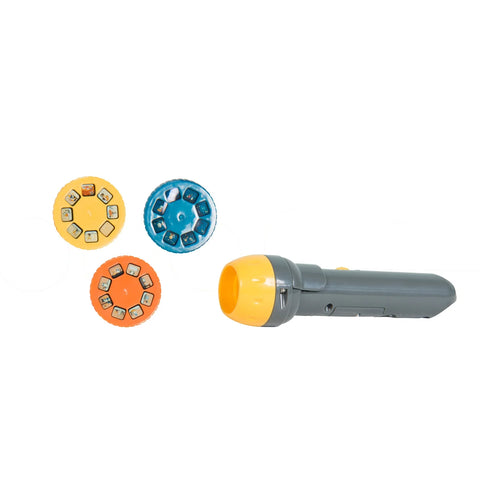 ¡Magica y divertida linterna que sirve de proyector para cada uno de los cuentos! Inserta uno de los discos en la linterna y observa como se proyecta en la pared. Cuenta, imagina y crea tus propias historia con ayuda de las imagenes proyectadas a color sin palabras ¡Un momento mágico y divertido para desarrollar la imaginación de los niños!