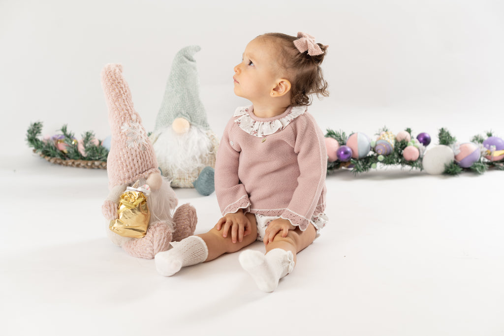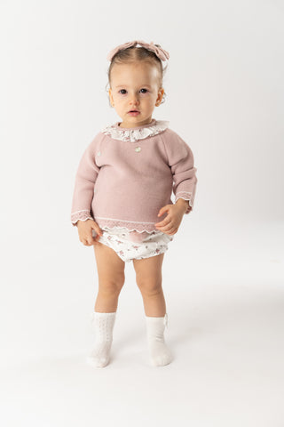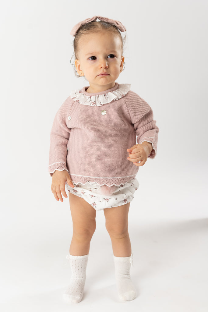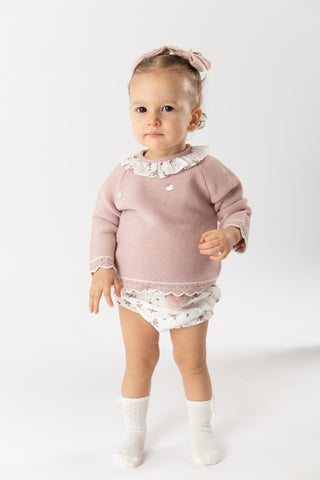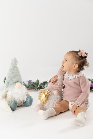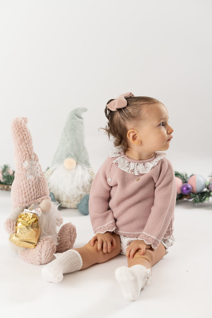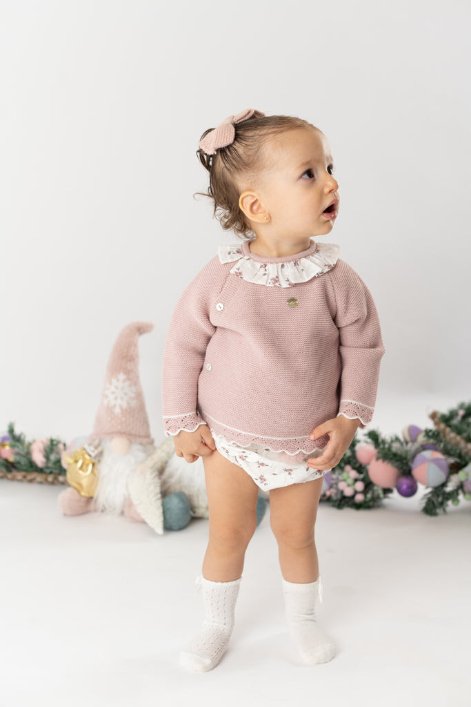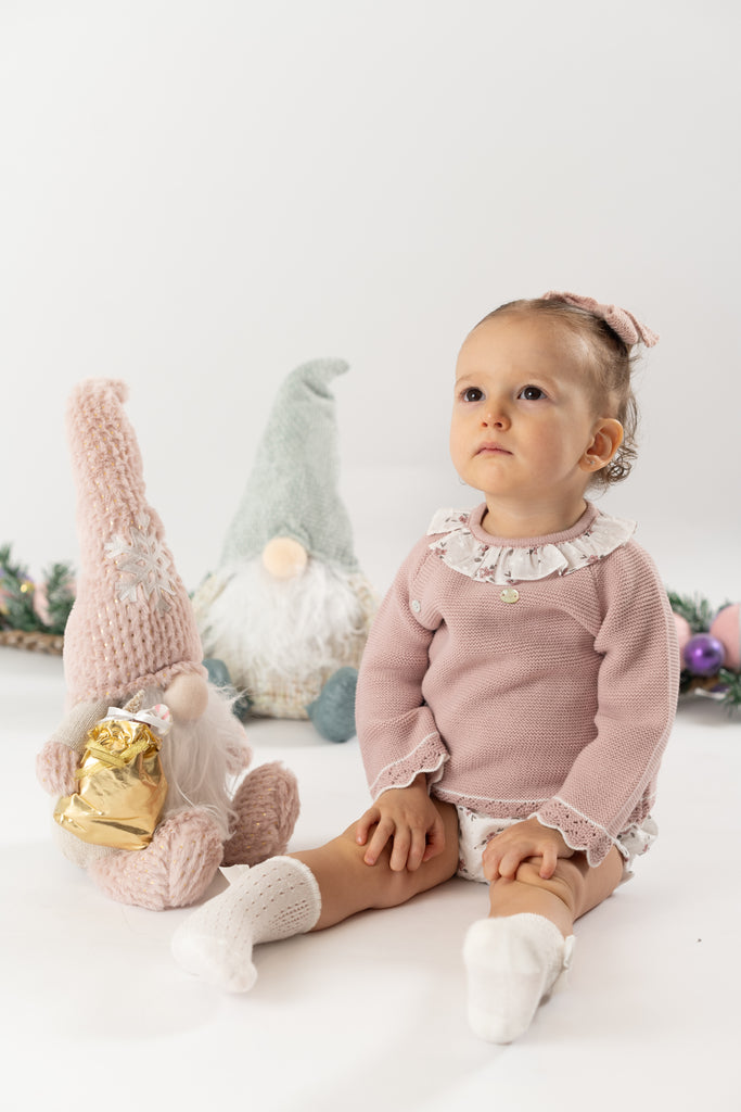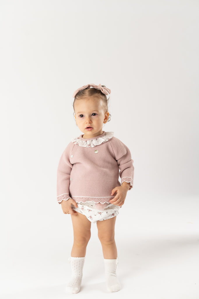¡Divino conjunto de 2 piezas a juego! Sueter de manga larga, cuello redondo con olan, cierre con botones en la espalda para facilitar la puesta de la prenda. Con sus shorts cortos tipo braguita, pompon frontal bordado, elastico en cintura y piernas para un efecto bombacho.