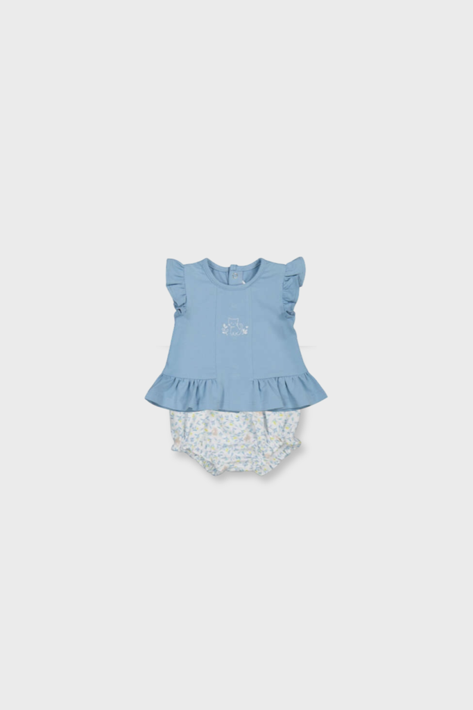 ¡Divino y fresco conjunto de blusa con su shorts cortos a juego! Blusa sin mangas con olan, cuello redondo, detalle de diseño bordado en el frente, cierre de botones a presion por atras y sus shorts cortos tipo calzoncito con elastico en cintura y piernas para efecto bombacho.