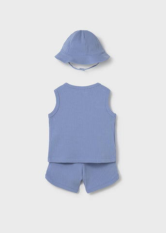 ¡Comodo y fresco conjunto de 3 piezas a juego! Playera de cuello redondo, sin mangas, cierre de botones por el frente para facilitar su puesta con sus shorts a juego con elastico en la cintura y su gorro a juego con cierre de velcro.