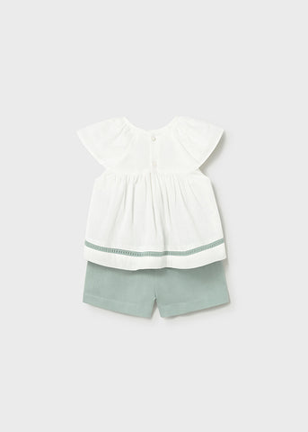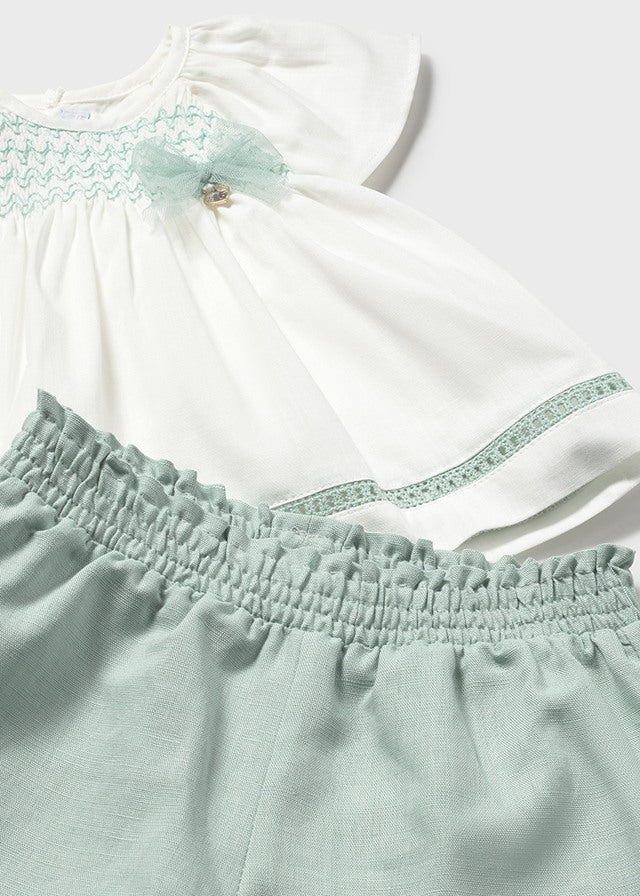 ¡Divino y fresco conjunto de blusa con su short tipo de lino a juego! Blusa sin mangas con olan, cuello redondo, detalle de smock en el pecho con lazo y cierre de botones a presion por atras y sus shorts de tela tipo lino con elastico en cintura para mayor ajuste.