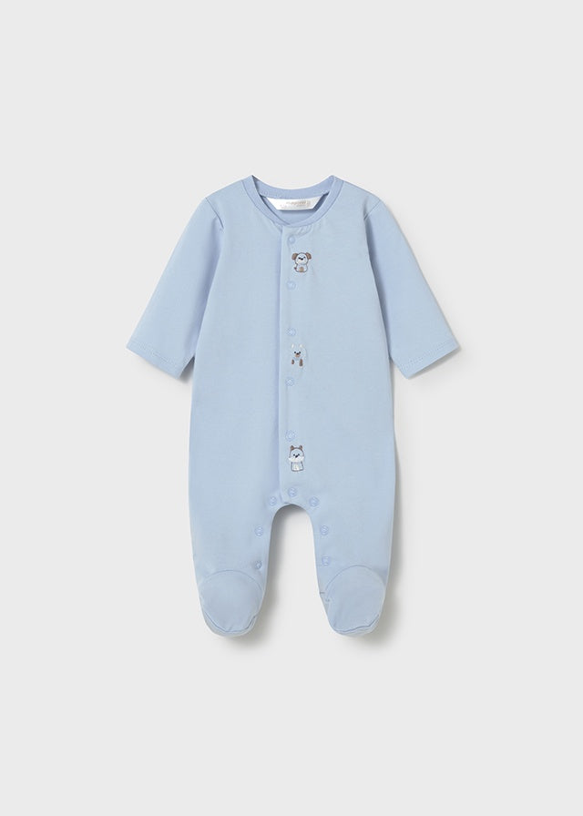 ¡Tierno mameluco con toques infantiles! Cuello redondo, manga larga, cierre central de botones a presion y en la entrepierna para facilitar su puesta, detalle de perritos bordados en el cierre.
