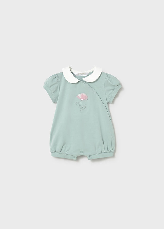 ¡Hermoso romper con detalle de flor bordada en el frente! De cuello camisero redondo, manga corta, dibujo bordado en el frente y con cierre con botones a presion por un lado y en la entrepierna para facilitar la puesta de la prenda.