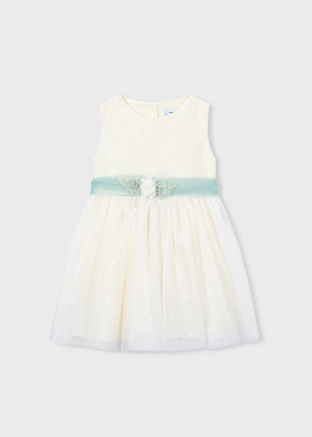 ¡Elegante y divino vestido con detalles que lo hacen lucir unico! ¡Pensado para tus eventos mas formales! De tela tipo lino, cuello redondo, sin mangas, corte en la cintura con lazo de tul que se amarra por detras con detalles bordados, falda esponjada y cierre de botones por la parte de atras para facilitar su puesta.