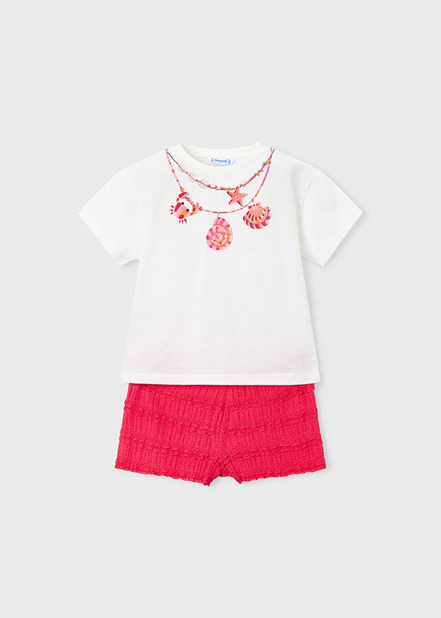 ¡Hermoso, comdo y fresco conjunto de blusita y short a juego! ¡Las niñas no querran quitarsela! Blusa de manga corta con cierre de lazo y pequeña abertura, cuello redondo, dibujo estampado con detalle bordado de cuentas. Con sus short a juego en color liso con detalle de encaje, elastico en la cintura para mayor ajuste.