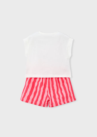 ¡Hermoso y fresco conjunto de blusa con su short a juego! ¡Las niñas no querran quitarselo! Blusa tipo crop-top, cuello redondo, dibujo estampado con detalles bordados y sus short de rayas a juego con elastico en la cintura para mayor ajuste.