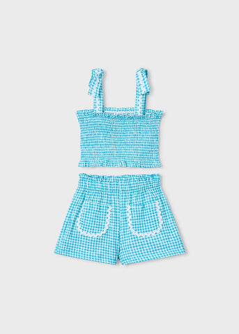 ¡Divino conjunto de blusa con sus shorts a juego! ¡Un look muy versatil pensado para cualquier ocasion! Blusa de tirantes con lazos, pecho recto, diseño fruncido de cuadros elastico. Shorts altos acampanados a juego, con elastico en la cintura para mejor ajuste, bolsillos frontales.