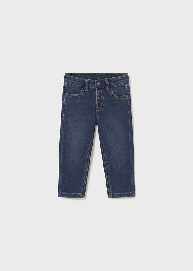 ¡Basicos y comodos jeans de mezclilla en tono azul medio! Pantalón largo de corte ajustado (Slim fit). Cierre de ziper simulado con botón, elástico regulable con botones en el interior de la cintura para mayor ajuste.