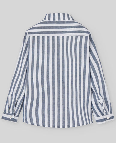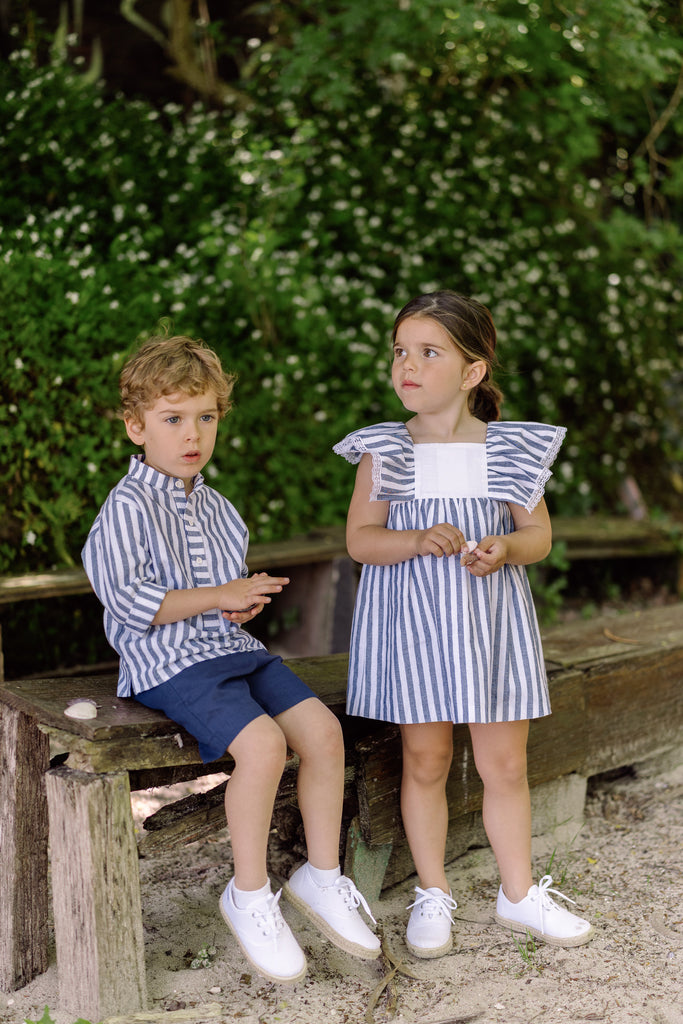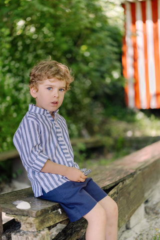 ¡Hermoso conjunto de bermudas cortas y camisa de estampado de rayas! Camisa de manga larga, cuello mao y cierre de botones por enfrente. Y sus bermudas cortas a juego, de color liso, cierre de botón y zíper, con elástico en el interior para ajustar el talle.