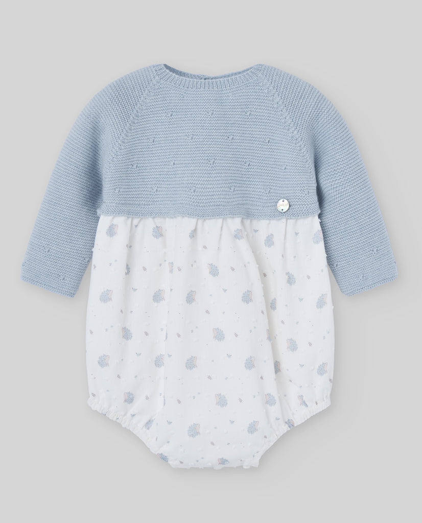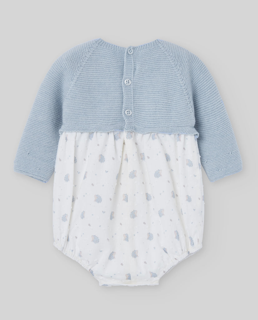 ¡Divino y tierno romper con toques infantiles! Una pieza combinada de tejido de punto con tela. Parte superior tejida, cuello redondo, manga larga, corte en la cintura de tela estampada con detalle de plumety, cierre de botones traseros y en la entrepierna para facilitar su puesta. Elastico en piernas para un efecto bombacho.
