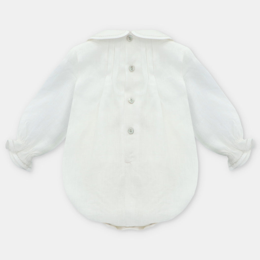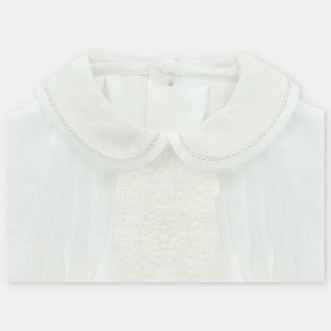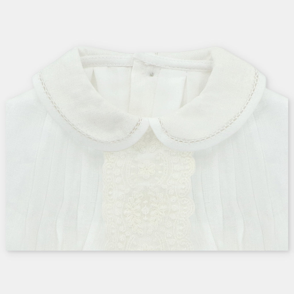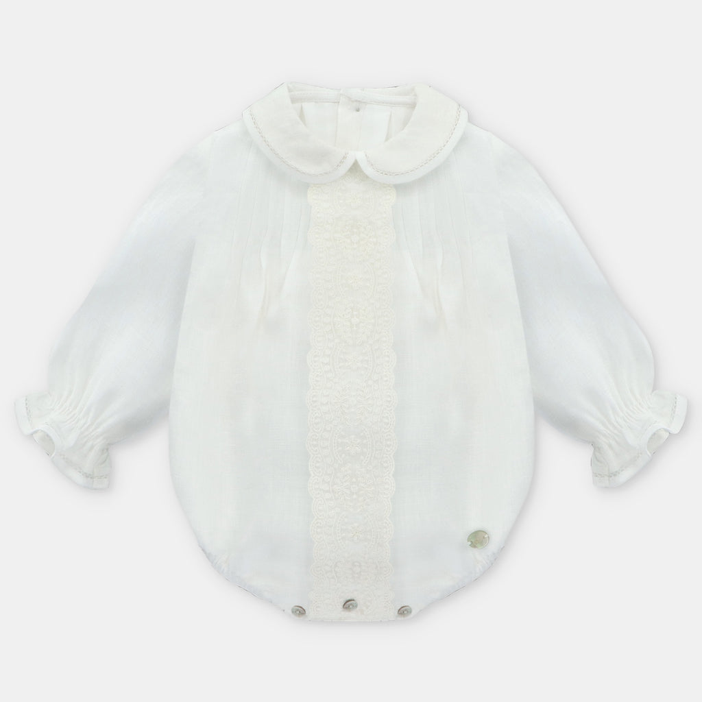 ¡Divino pañalero con detalles que lo hacen lucir elegante!¡Pensado para tus eventos/ceremonias mas importantes! De cuello camisero redondo, manga larga con elastico en puños, detalle de encaje frontal central. Cierre de botones por atras y en la entrepierna para facilitar su puesta.
