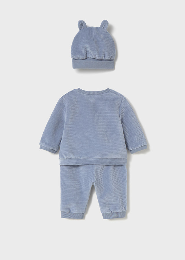 ¡Divino set de 3 piezas a juego! Sudadera de manga larga, cuello redondo, botón en el hombro para facilitar la puesta de la prenda y sus pants tipo deportivo de gran confort, elástico en cintura y bolsillos funcionales en la parte delantera. Gorro de materiales cálidos y flexibles, que garantizan un ajuste perfecto a la cabeza y máxima comodidad para protegerle del frío con aplique de orejitas.
