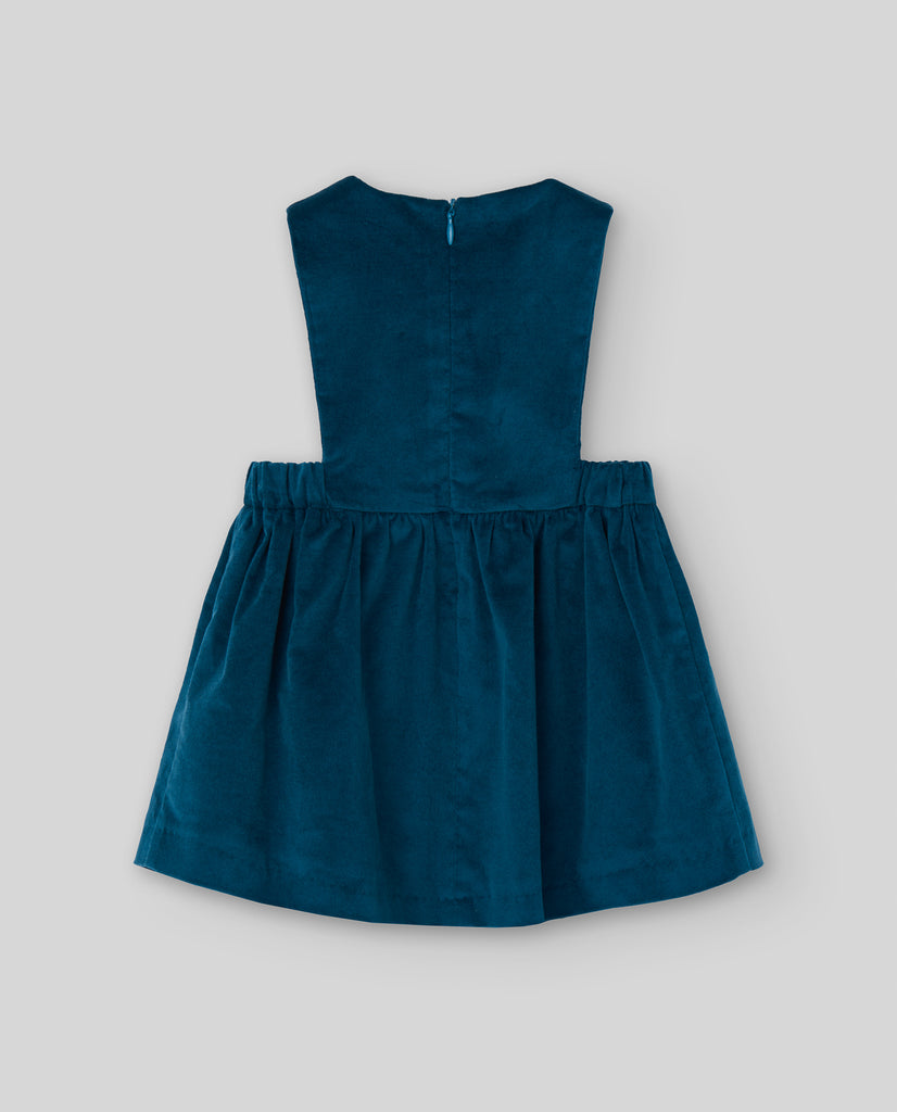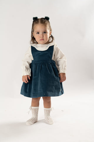 ¡Divino conjunto de jumper de falda con su blusa a juego! ¡Un conjunto clasico y versatil pensado para todo tipo de ocasion! Jumper de tirantes anchos y falda fruncida, cierre de ziper trasero invisible para facilitar su puesta. Tela de pana. Y con su blusa a juego de cuello con babero, detalle de bordado, manga larga con puños elasticos y cierre de botones por atras.