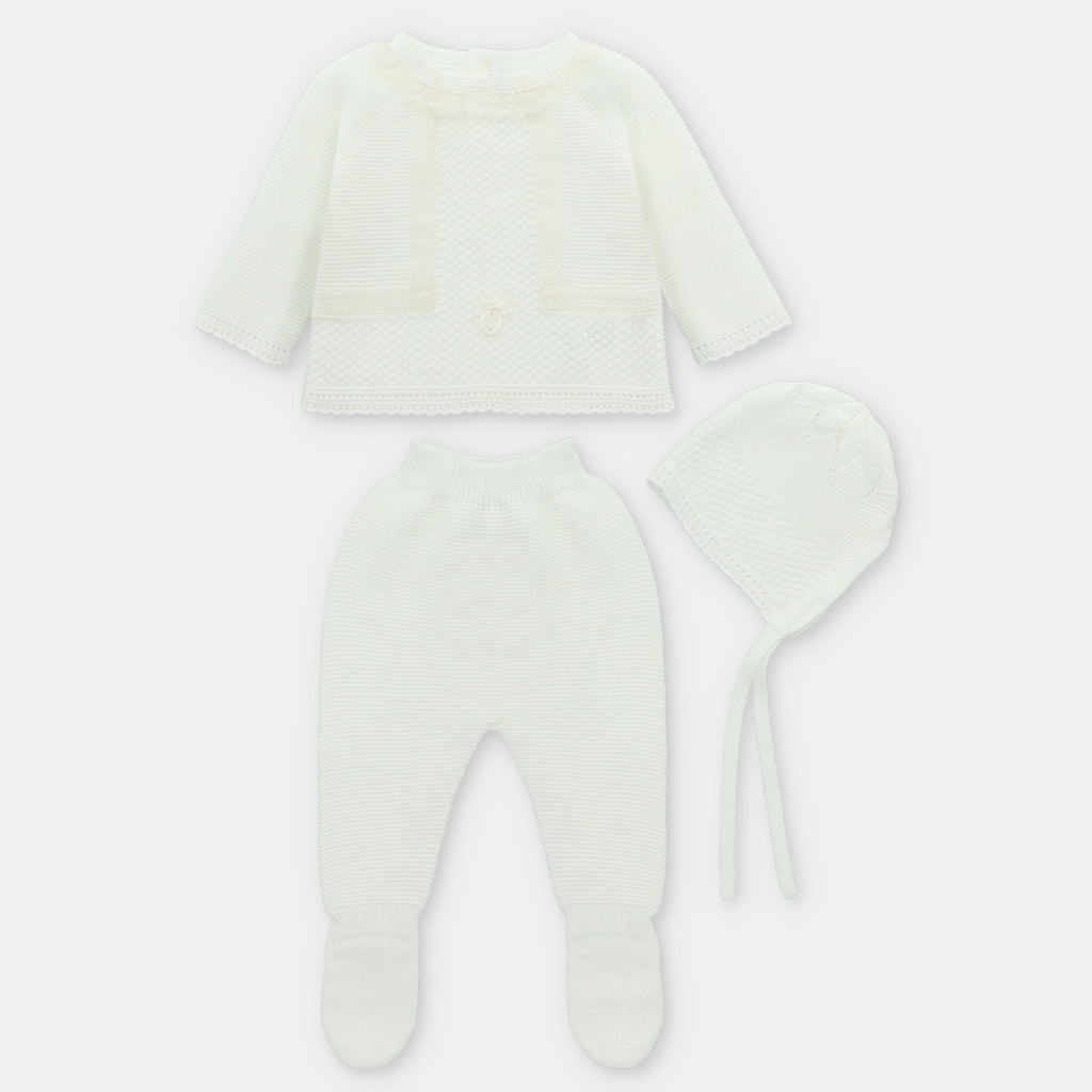 ¡Hermoso y tierno conjunto tejido de 3 piezas a juego! Parte de arriba tejida de punto con relieve, cuello redondo con olan, manga larga y sus pantalones a juego, elastico en la cintura para mejor ajuste. Y su gorrito a juego, un accesorio combinable y versátil, ideal como complemento de cualquier look.