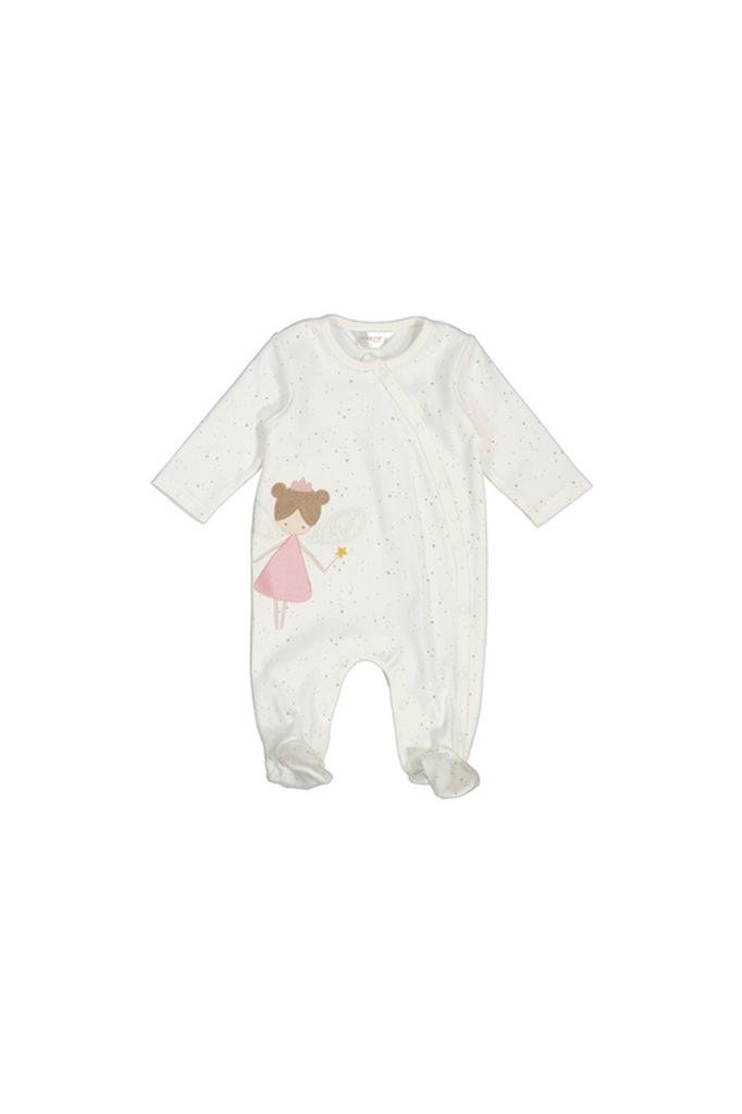 ¡Divino mameluco con dibujo de hada bordada! Cuello redondo, manga larga, estampado de puntitos con detalle de hada bordada por el frente, cierre de botones a presion por el centro de lado y en la entrepierna para facilitar su puesta.