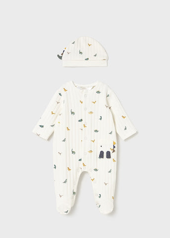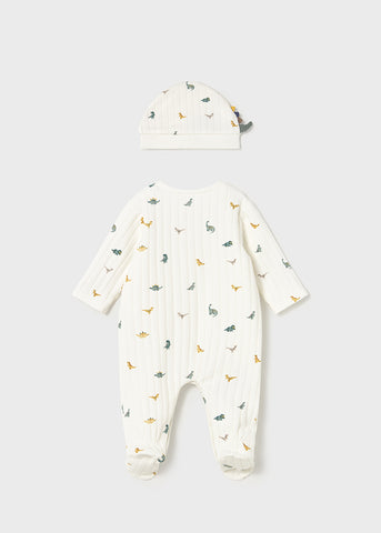 ¡Tierno mameluco con su gorrito a juego de estampado de dinosaurios! Cuello redondo, manga larga, estampado de dinosaurios, cierre de botones a presion por el centro y en la entrepierna para facilitar su puesta. Y su gorrito a juego, un accesorio combinable y versátil, ideal como complemento de cualquier look.