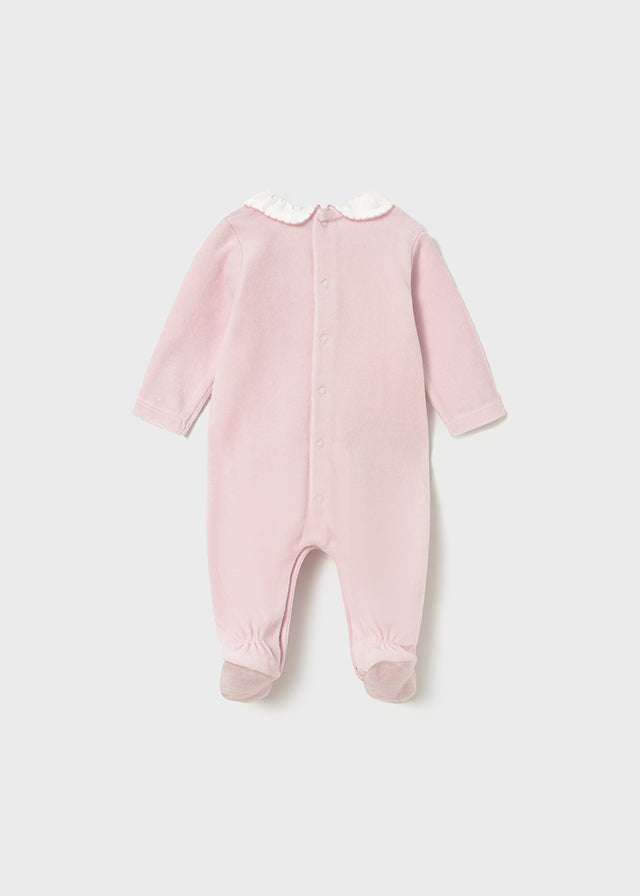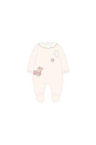 ¡Encantador mameluco afelpado de color liso con tiernos detalles! Cuello redondo con olan, manga larga, perrita y estrellas bordadas frontales y cierre de botones a presion por atras y en la entrepierna para facilitar su puesta.