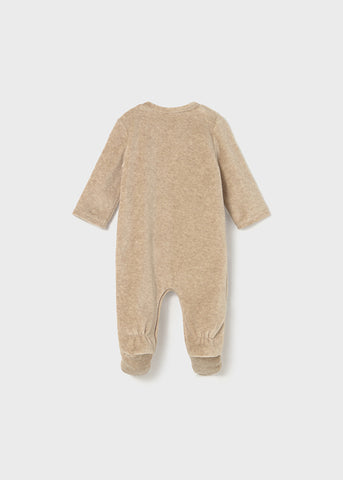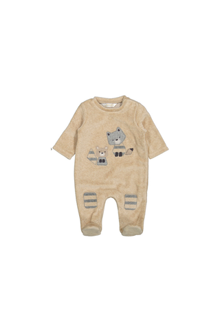 ¡Tierno mameluco afelpado con animales bordados! Cuello redondo, manga larga, bolsillos frontales de rayas, zorro y oso bordado por el frente y cierre de botones a presion por un lado y en la entrepierna para facilitar su puesta.